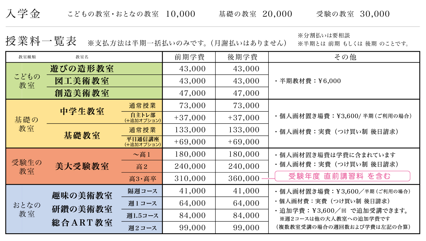 ※受験生の教室の学費には個人画材置き場費が含まれていますが、所定より多くの施設利用が必要な場合は、半期¥3,600で別途請求いたします。